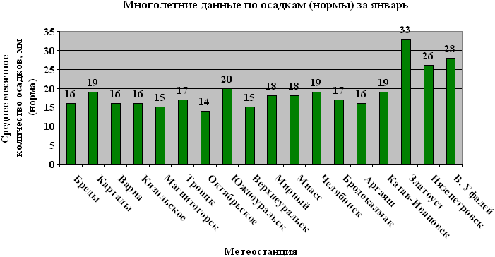 В северной половине области выпадает 25-33 мм осадков. На остальной территории количество выпавших осадков составляет 14-19 мм. В отдельные годы количество осадков, как превышает норму в 2-4 раза (50-86 мм), так бывает и ниже нормы в 6-18 раз (0-3 мм). Так, в городе Челябинске в январе 1963 г. выпало снега в 3,4 раза больше обычного. В январе 1995 г. – 5% месячной нормы осадков. Число дней с осадками 1 мм и более колеблется от 9 до 18. В январе очень редко могут наблюдаться смешанные осадки (мокрый снег с дождем). Количество смешанных осадков составляет 1 мм, твердых осадков (снег) – от 14 до 31 мм. Средняя продолжительность осадков в январе составляет 124-210 часов. Максимальная продолжительность осадков в городе Челябинске составляет 255 часов.